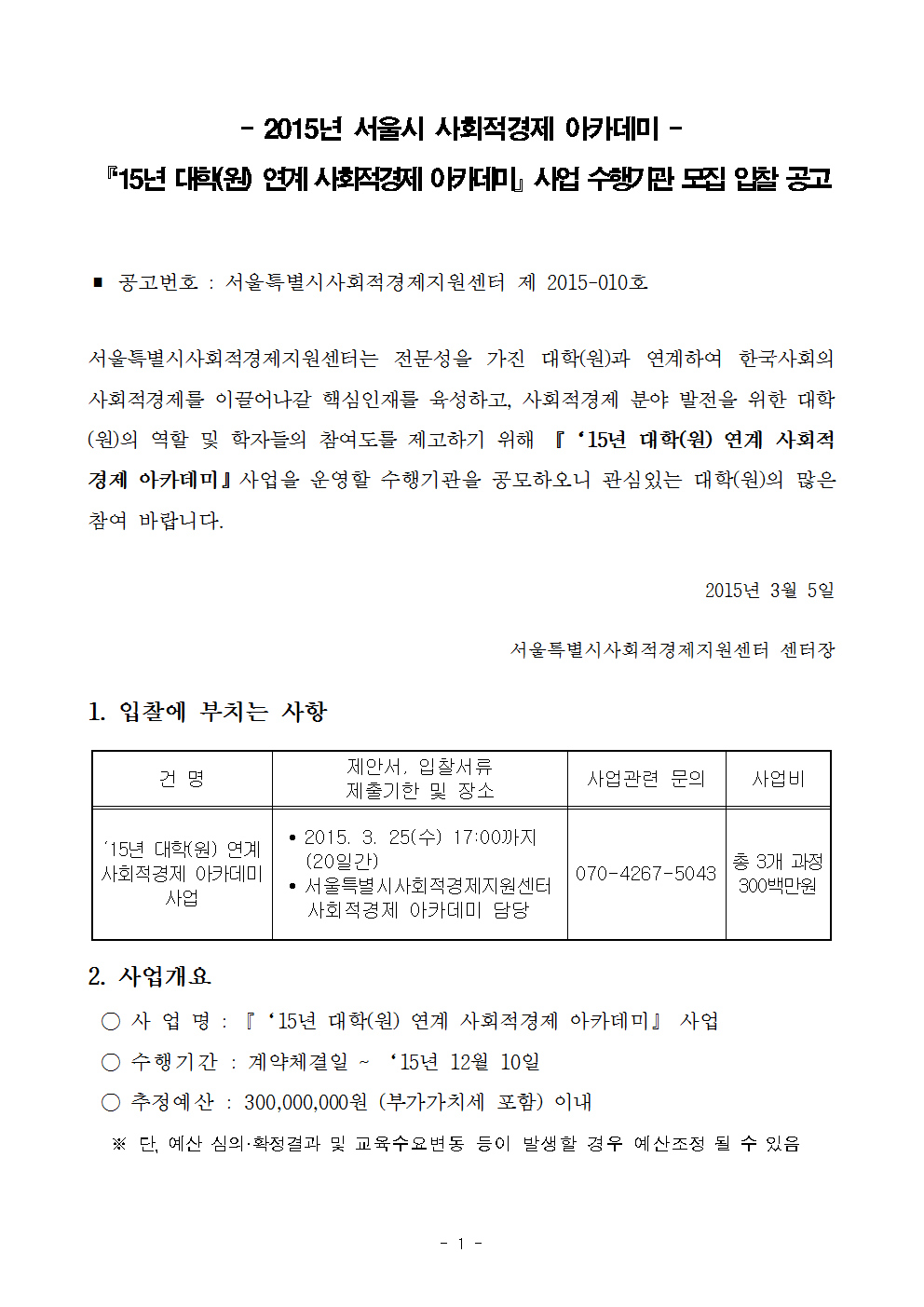 [공고] ’15년 대학(원) 연계 사회적경제 아카데미 사업 수행기관 모집 입찰 공고(~3.25)