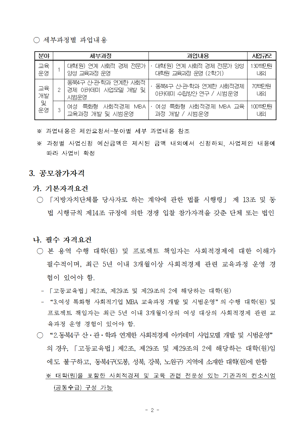 ○ “2.동북4구 산·관·학과 연계한 사회적경제 아카데미 사업모델 개발 및 시범운영”의 경우, 「고등교육법」제2조, 제29조 및 제29조의 2에 해당하는 대학(원)임에도 불구하고, 동북4구(도봉, 성북, 강북, 노원구) 지역에 소재한 대학(원)에 한함