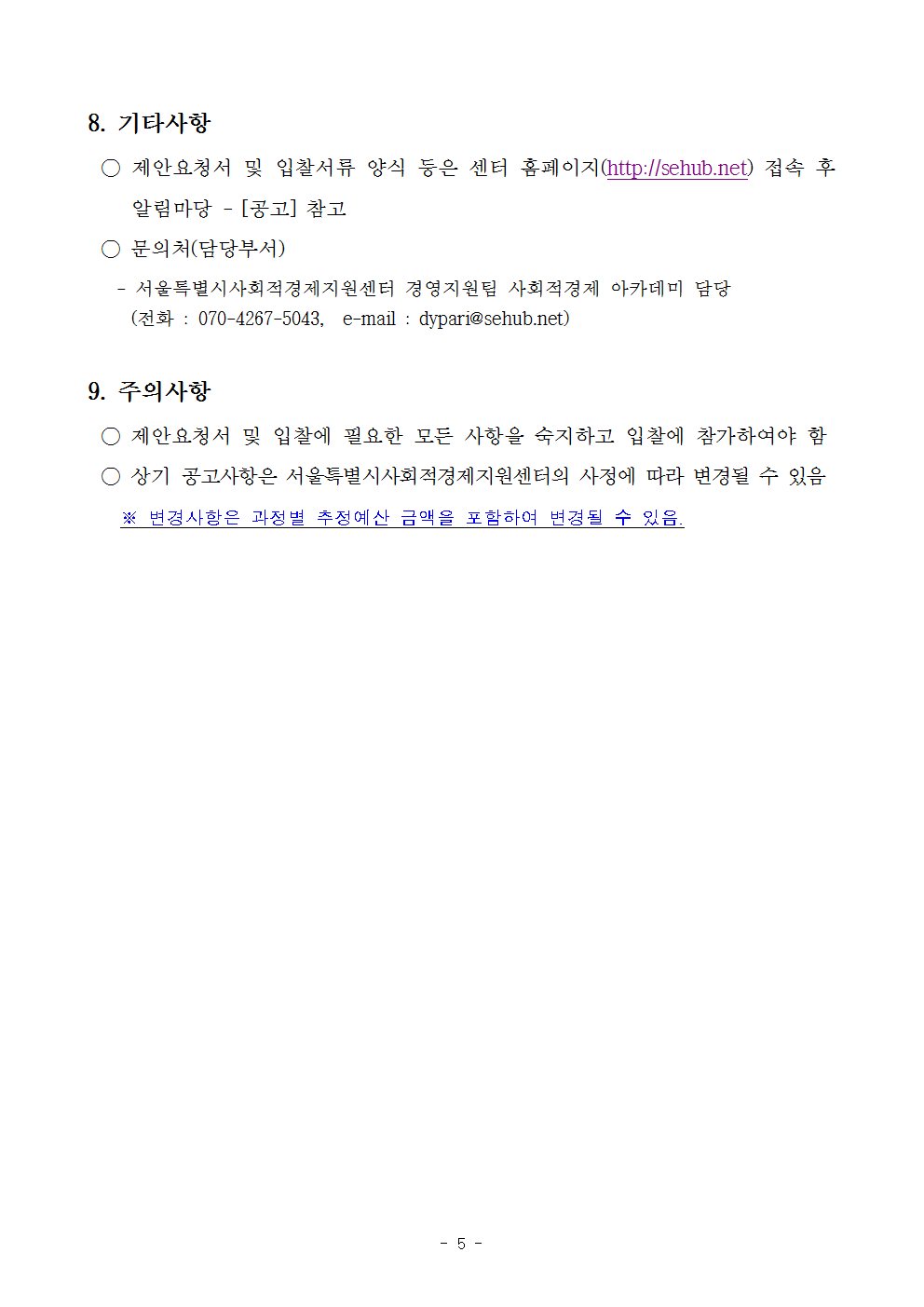 ○ 상기 공고사항은 서울특별시사회적경제지원센터의 사정에 따라 변경될 수 있음