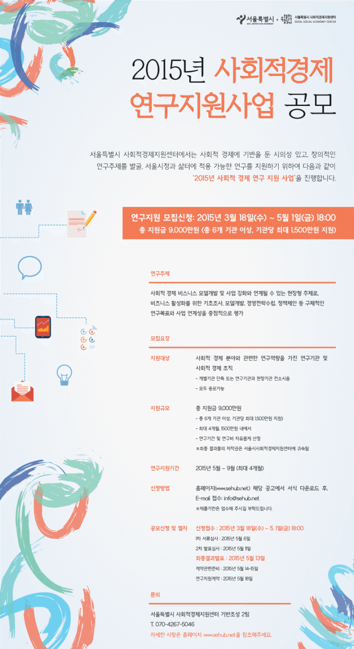 서울특별시 사회적경제지원센터에서는 사회적 경제에 기반을 둔 시의성 있고 창의적인 연구주제를 발굴, 서울시정과 삶터에 적용 가능한 연구를 지원하기 위하여 다음과 같이 ‘2015년 사회적 경제 연구 지원 사업’을 진행합니다.