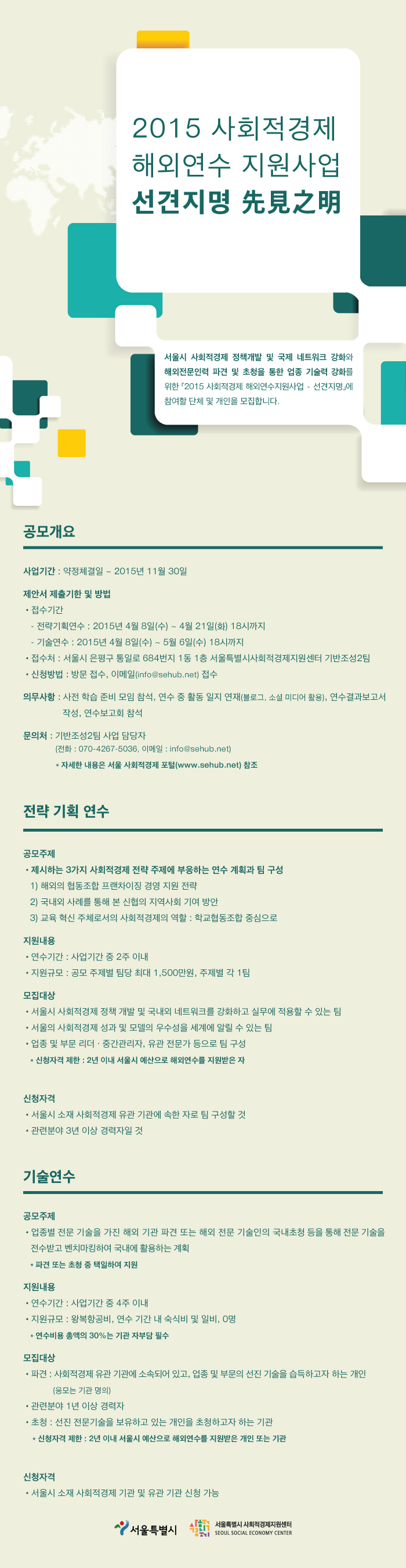 서울특별시사회적경제지원센터 공고 제 2015-018호 2015 사회적경제 해외연수 지원사업 관련하여 수정사항을 정정공고 합니다.