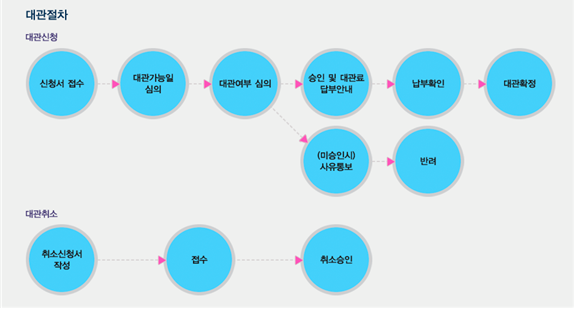 · 일반대관은 대관신청 후 업무일기준 2일 이내, 장기대관은 7일 이내에 대관여부결과를 이메일로 보내드립니다.