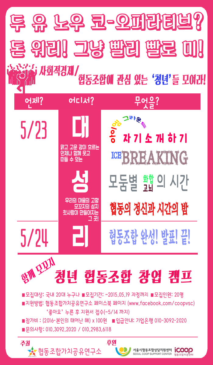 협동조합가치공유연구소에서 협동조합 창업 캠프를 가실 참가자 분들을 모집합니다.