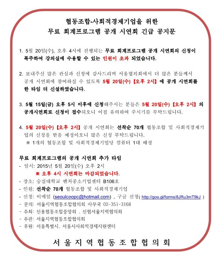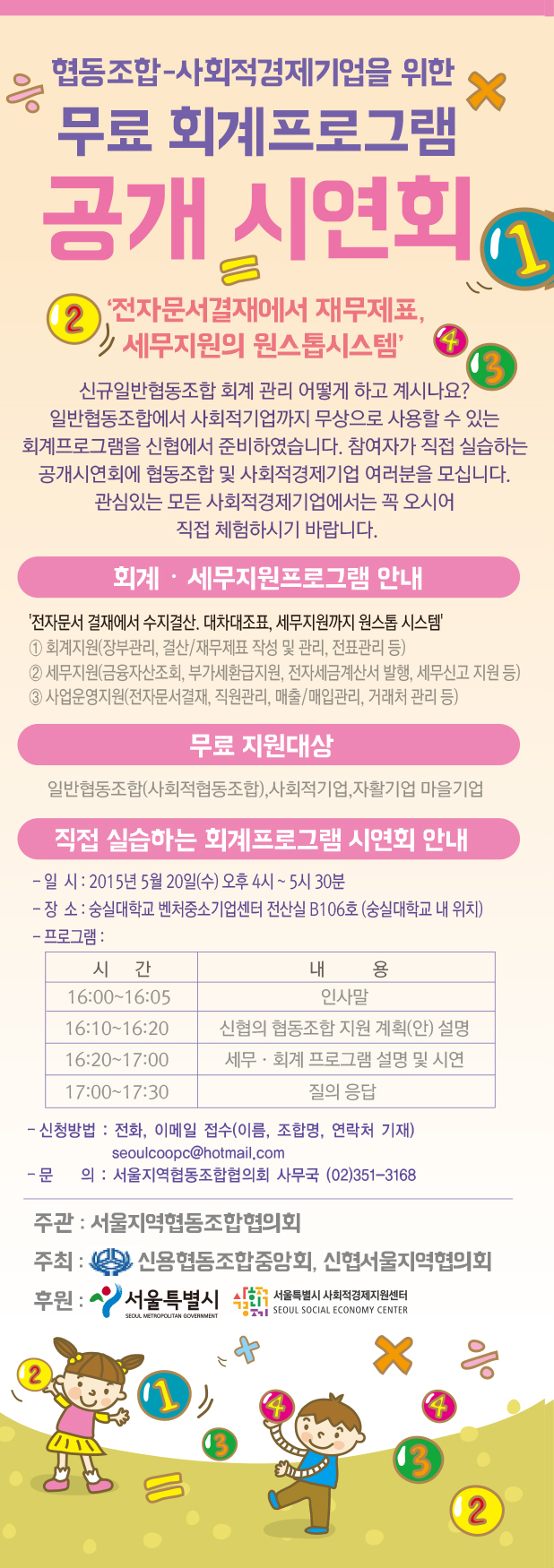 이번 공개 시연회에서는 회계프로그램을 직접 실습하는 자리를 마련하였으니 많은 참석 부탁드리며 주변 협동조합과 사회적경제 기업에도 홍보해주세요.