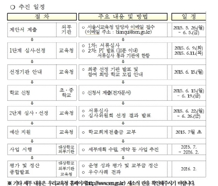 1단계로 외부기관 공모 프로그램에 대한 적격 심사를 실시하고, 선정된 프로그램을 학교에 안내합니다. 2단계로 학교에서 희망 프로그램을 선택하거나 학교자율운영 프로그램을 신청하면 연계심사를 거쳐 40~50개의 초·중학교에 최대 1000만원을 지원할 예정입니다.