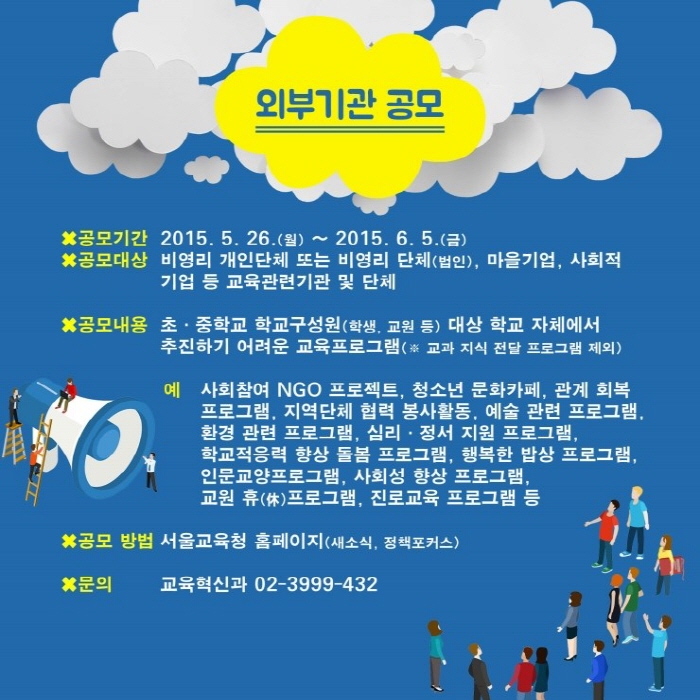 서울시교육청은 이번 공모사업을 통해 학생들이 각자의 꿈을 찾고 개성을 실현할 수 있도록 돕고자 합니다. 또한, 학교와 지역사회가 소통·공유·협력하는 다양한 모델을 발굴하고 우수사례를 전파함으로써 학교구성원과 지역사회기관의 자발적 참여를 통한 교육공동체 문화형성 등 학교혁신 분위기 확산을 기대하고 있습니다.