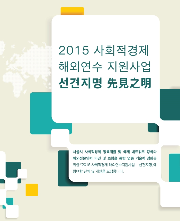 서울특별시사회적경제지원센터는 서울시 사회적경제 정책개발 및 국제 네트워크 강화와 해외 전문인력 파견 및 초청을 통한 업종 기술력 강화를 위하여 『2015 사회적경제 해외연수 지원사업 선견지명』을 다음과 같이 재‧신규공모하오니 관련 기관 및 단체의 많은 관심과 참여 바랍니다.