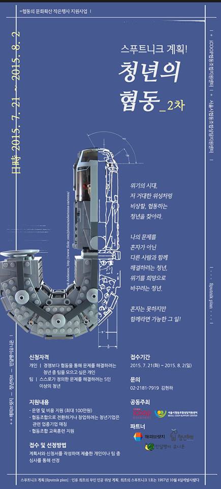처음 하늘로 올라간 저 거대한 위성처럼 위기의 시대에 비상할, 협동하는 청년을 찾습니다. 나의 문제를 혼자가 아닌 다른 사람과 함께 해결하려는 청년. 위기를 희망으로 스스로 바꾸는 도전하는 청년.집 걱정부터 취업걱정까지 혼자는 못하지만 함께 하면 가능할 문제를 발견하고 이를 해결할 청년들을iCOOP생협과 서울시 협동조합 상담지원센터에서 지원, 육성하려고 합니다. 우리 주위의 모험심 만만한 청년들의 많은 참여 바랍니다.