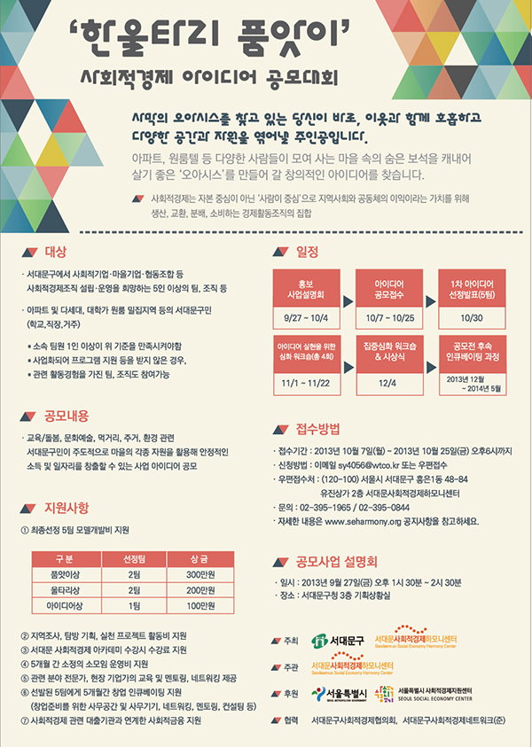 사회적경제 공지 [안내] ‘한울타리 품앗이’ 사회적경제 아이디어 공모대회(~10/25) 2013-09-13 조회 : 4675댓글 : 0 주최/주관 : 관리자 130912_서대문_webposter_0912(1).jpg_신청양식.hwp 신청양식은 첨부파일을 참조해주세요 첨부파일 _신청양식 (43 kB) 130912_서대문_webposter_0912(1) _신청양식 < > 인쇄 목록 수정