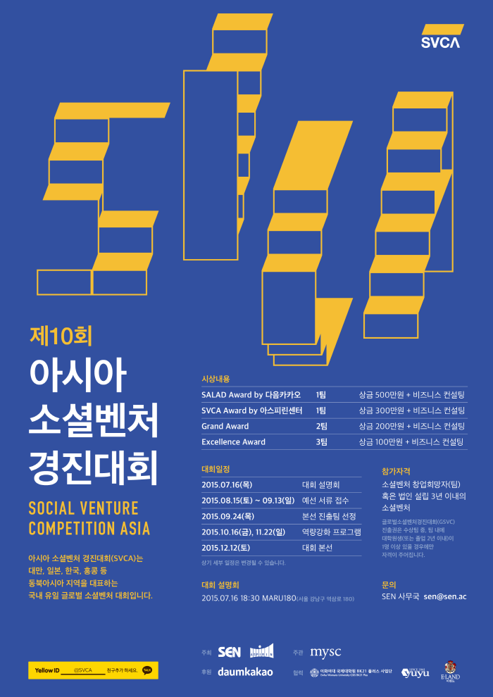 – 대회 소식을 받아보시려면 페이스북 'SVCA 아시아 소셜벤처 경진대회' 페이지에 '좋아요'를 눌러주세요.