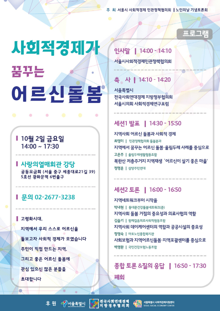 [공지]’사회적경제가 꿈꾸는 어르신 돌봄'(10.2) – 노인의 날 기념토론회