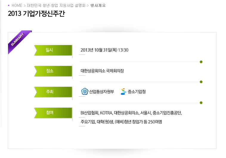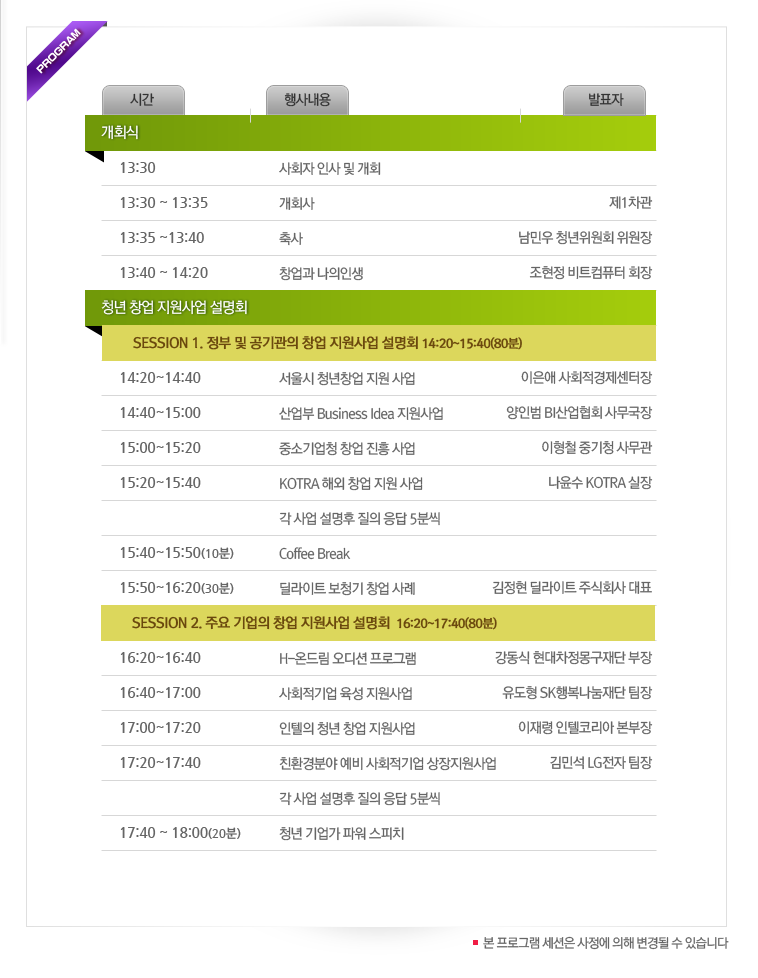 이 행사는 현재 청년창업과 관련한 민관 합동의 최초 설명회로서 창업에 관심있는 청년들에게는 정부와 민간에서 어떠한 도움을 받을 수 있는지 큰 그림을 볼 수 있는 의미있는 행사가 되리라 생각합니다. 많은 참여 부탁드립니다.