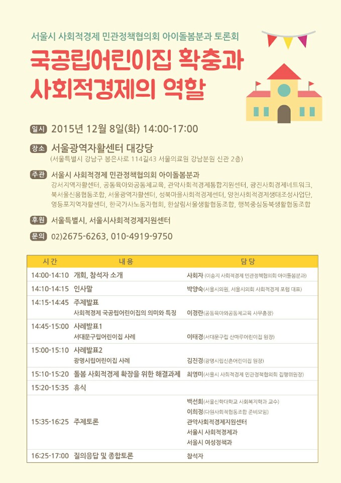 [공지] 서울시사회적경제 민관정책협의회 아이돌봄분과 토론회 – 국공립어린이집 확충과 사회적경제의 역할(12.8)