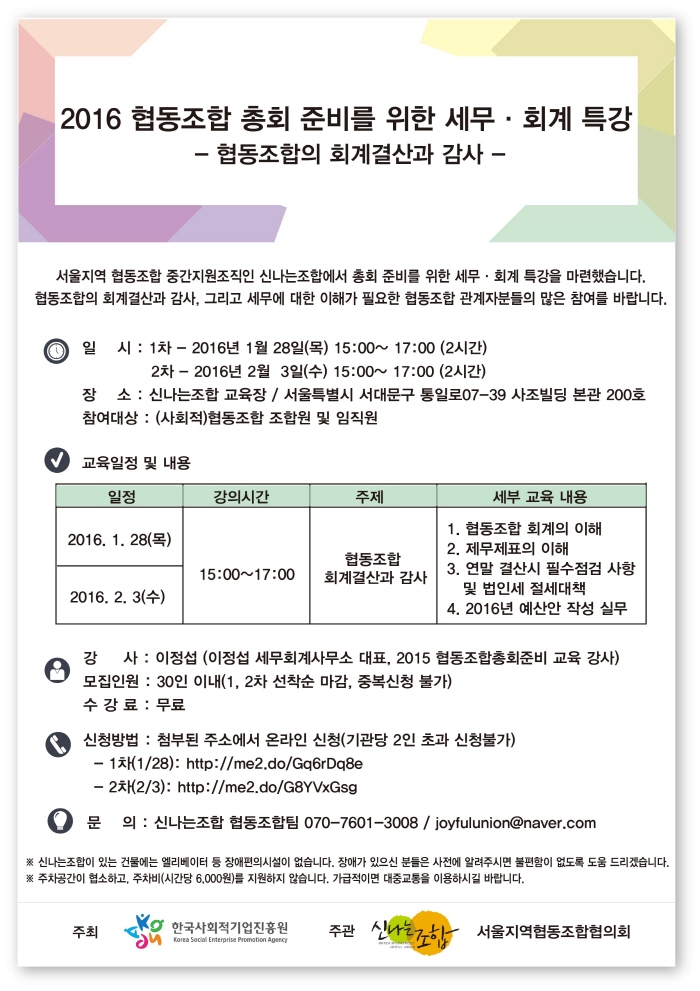 [안내] 2016 협동조합 총회 준비를 위한 세무/회계 특강 (1.28, 2.3)