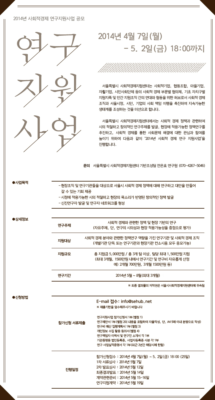 사회적경제 공지 [공고] 2014년 사회적경제 연구지원 공모사업 2014-04-07 조회 : 3936댓글 : 0 주최/주관 : 관리자 모집일정 : 2014-04-07 ~ 2014-05-02 20140407_webposter_hana-022.jpg(2014)_공고안.hwpstudy_notice_2014.zip study_notice_2014 첨부파일 (2014)_공고안 (32 kB)study_notice_2014 (23 kB) 20140407_webposter_hana-022 (2014)_공고안 study_notice_2014 < > 인쇄 목록 수정