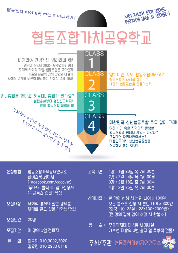 그래서 저희 협동조합가치공유연구소에서 올해 첫 교육 프로그램을 운영합니다. 사회적 경제가 절대 만능은 아닙니다. 결국 운영하는 사람이 어떠냐에 따라 달라질 수 있습니다. 이런저런 청년들이 네트워크를 통해 새로운 사람을 알아가고, 사회적 경제 및 협동조합에 대한 이야기도 듣고, 실제 협동조합 사례와 설립 시뮬레이션을 통해 직접 경험하는 기회를 만들어가세요.
