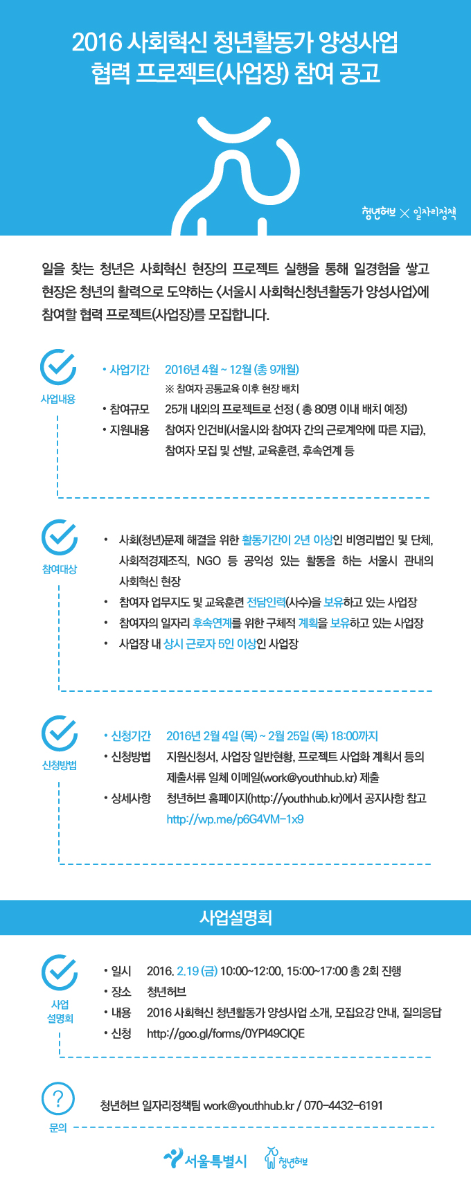 [안내] 청년허브- 2016 사회혁신 청년활동가 양성사업 협력 프로젝트(사업장) 참여 공고(~2.25)