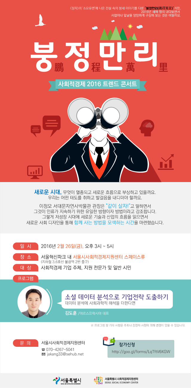 사회적경제 공지 [안내] 붕정만리, 사회적경제 2016 트렌드 콘서트 – 소셜 데이터 분석으로 기업전략 도출하기(2.26) 2016-02-18 조회 : 1492댓글 : 0 주최/주관 : 관리자 모집일정 : 2016-02-26 ~ 2016-02-26 사회적경제2016트렌드-콘서트2차-웹용.jpg 강연 일시 : 2016. 2. 26(금) , 오후 3시 장소: 서울 사회적경제지원센터 내 스페이스류 ★ 참가신청 ★ http://goo.gl/forms/LqTftV6KGW 사회적경제2016트렌드-콘서트(2차)-웹용 김도훈 붕정만리 빅데이터 빅데이터 분석 사회적경제 2016 트렌트 콘서트 소셜 데이터 분석으로 기업전략 도출하기 아르스프락시아 < > 인쇄 목록 수정