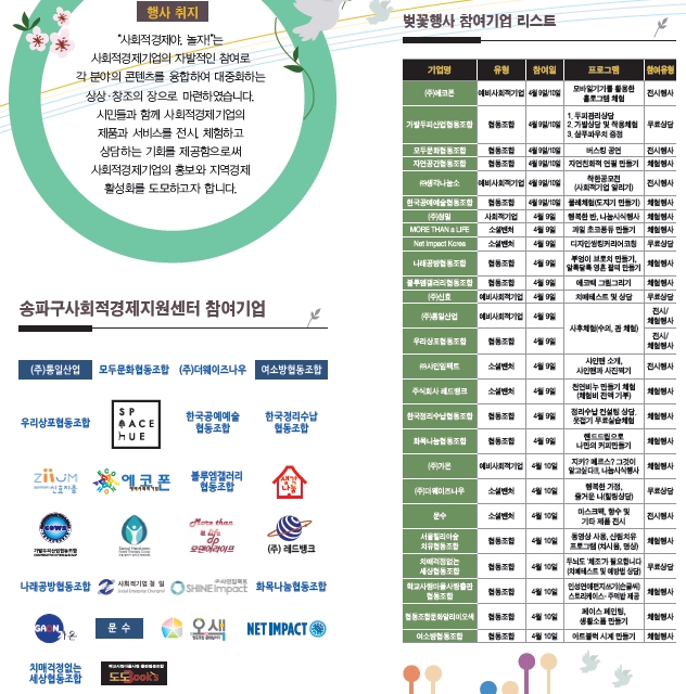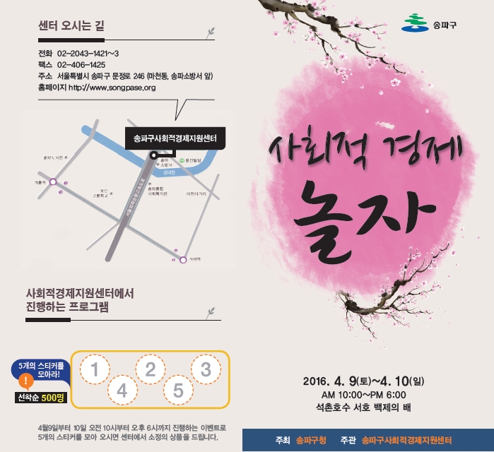 사회적경제 공지 [안내] 송파 사회적경제지원센터 ‘사회적경제야, 놀자'(4.9~10) 2016-04-05 조회 : 709댓글 : 0 주최/주관 : 관리자 모집일정 : 2016-04-09 ~ 2016-04-10 songpa2.jpgsongpa1.jpgsongpa.jpg songpa2 songpa1 songpa 석촌호수 송파구 전시 체험 < > 인쇄 목록 수정