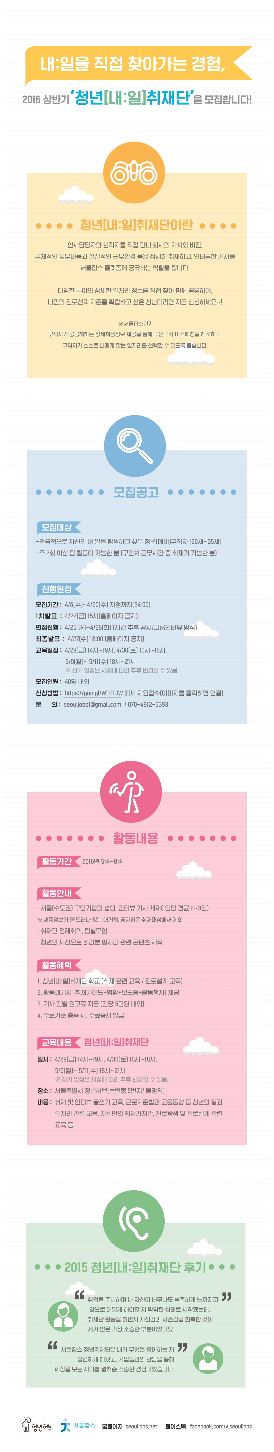 사회적경제 공지 [안내] 2016 상반기 ‘청년[내:일]취재단’을 모집합니다!(~4.20) 2016-04-08 조회 : 713댓글 : 0 주최/주관 : 관리자 모집일정 : 2016-04-08 ~ 2016-04-20 내일취재단-웹자보-최종.jpg 자세한 내용 보기 http://seouljobs.net 내일취재단 웹자보 최종 seouljobs 기자단 내일 서울잡스 < > 인쇄 목록 수정