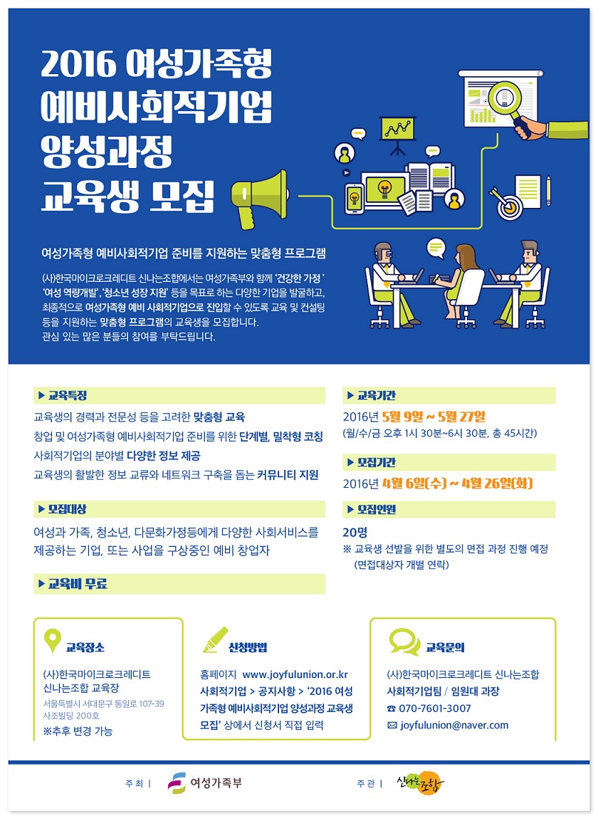 사회적경제 공지 [안내] 2016 여성가족형 예비사회적기업 양성과정 교육생 모집(~4.26) 2016-04-14 조회 : 734댓글 : 0 주최/주관 : 관리자 모집일정 : 2016-04-06 ~ 2016-04-26 여성가족형-교육생모집_0412_최종본크기조정.jpg 신청하기 http://www.joyfulunion.or.kr 여성가족형 교육생모집_0412_최종본(크기조정) 교육 사회적기업 신나는조합 여성가족형 < > 인쇄 목록 수정