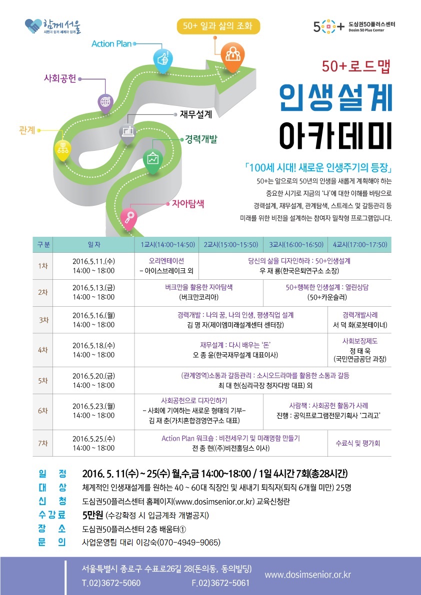 사회적경제 공지 [안내] 50+로드맵 인생설계아카데미(직장인 및 새내기퇴직자편) 참여자모집 2016-05-02 조회 : 872댓글 : 0 주최/주관 : 관리자 모집일정 : 2016-04-28 ~ 2016-05-08 50aca.jpg 자세한 내용 더 보기 50aca 50+ 50플러스 아카데미 인생이모작 < > 인쇄 목록 수정