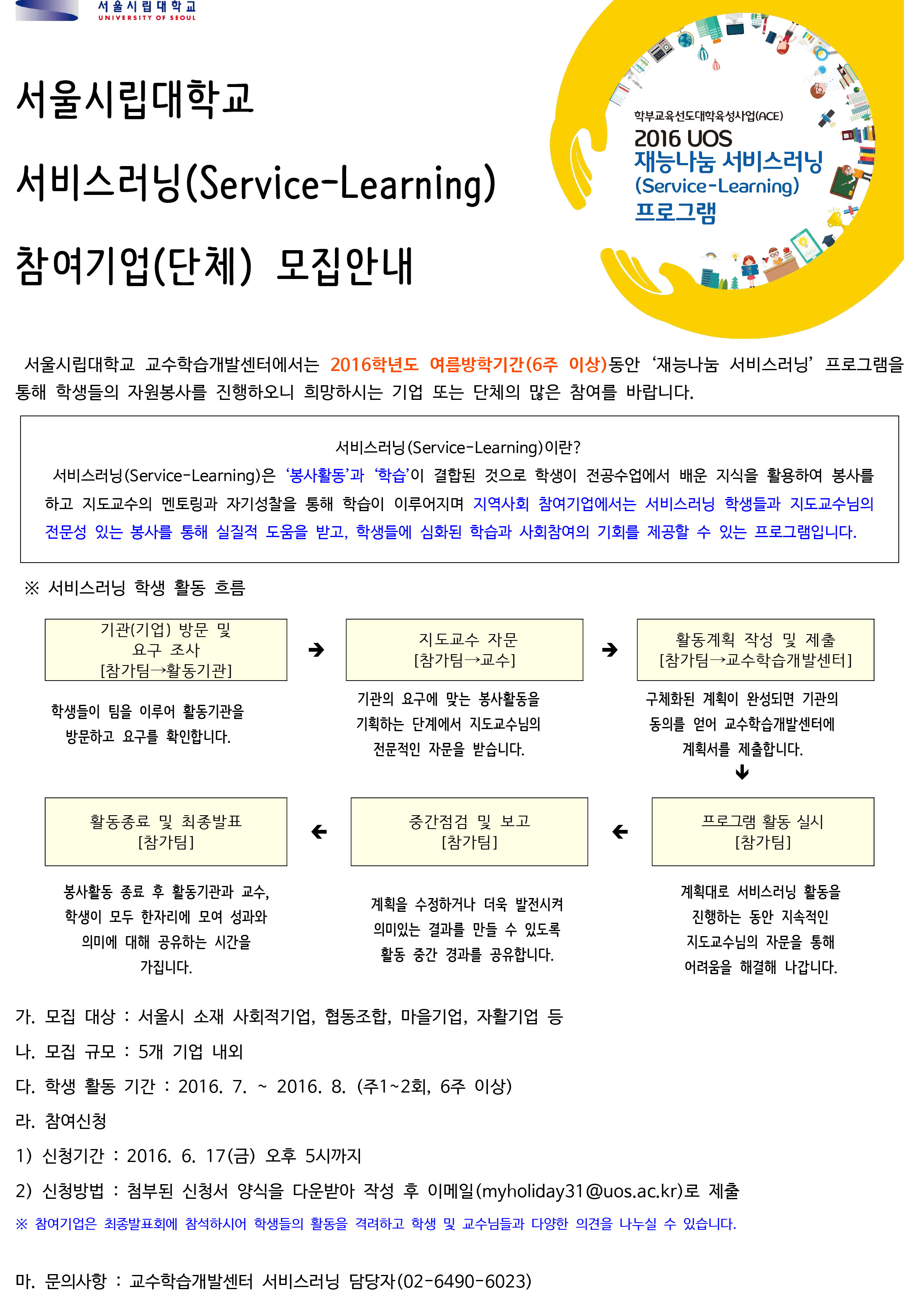 사회적경제 공지 [안내] 서울시립대학교 서비스러닝 참여기업(단체) 모집(~6.17) 2016-06-13 조회 : 724댓글 : 0 주최/주관 : 관리자 모집일정 : 2016-06-13 ~ 2016-06-17 service_learning.jpg service_learning 서비스러닝 서울시립대학교 < > 인쇄 목록 수정