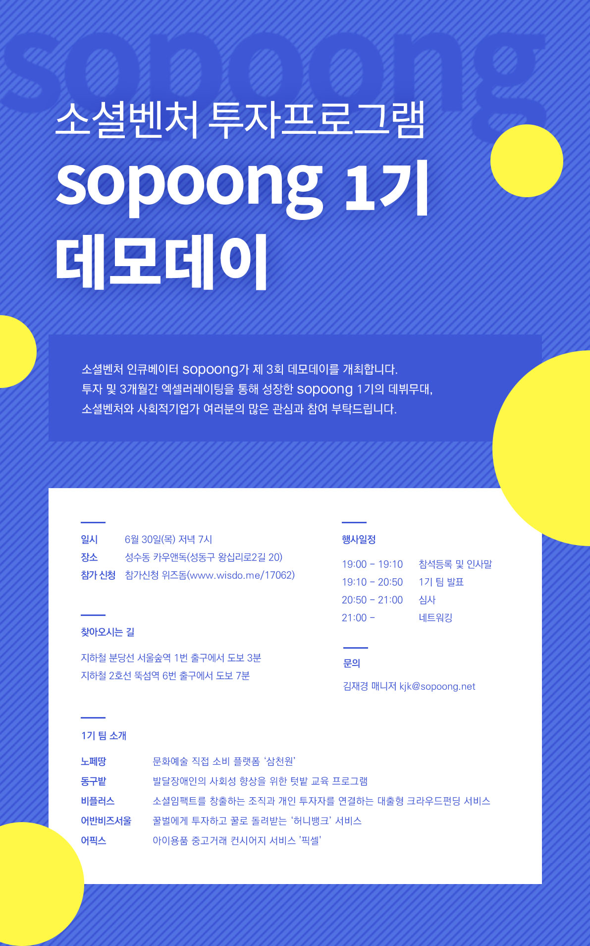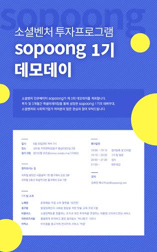 사회적경제 공지 [안내] 소셜벤처프로그램 sopoong 투자프로그램 1기 데모데이 개최 (6.30) 2016-06-14 조회 : 997댓글 : 0 주최/주관 : 관리자 사본-160630데모데이-웹포스터.jpg66bce81b-6382-4238-b117-ab9e8ebba0f7.jpg 사본 -160630데모데이 웹포스터 66bce81b-6382-4238-b117-ab9e8ebba0f7 < > 인쇄 목록 수정