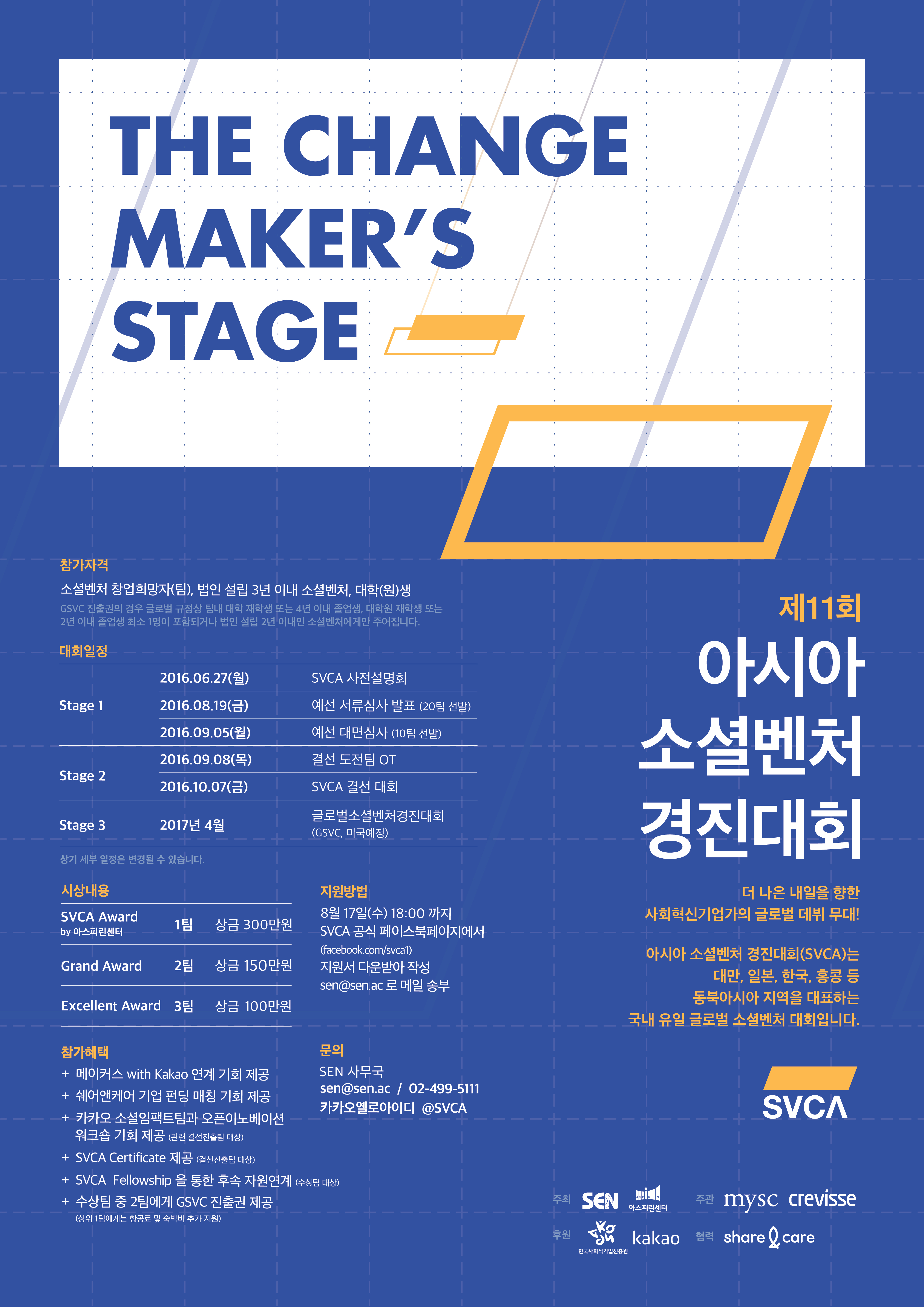 제11회 아시아소셜벤처경진대회(SVCA)는 SEN 서울시아스피린센터 주최, MYSC, 크레비스파트너스 주관, 한국사회적기업진흥원과 카카오가 후원하고 쉐어앤케어가 협력합니다.