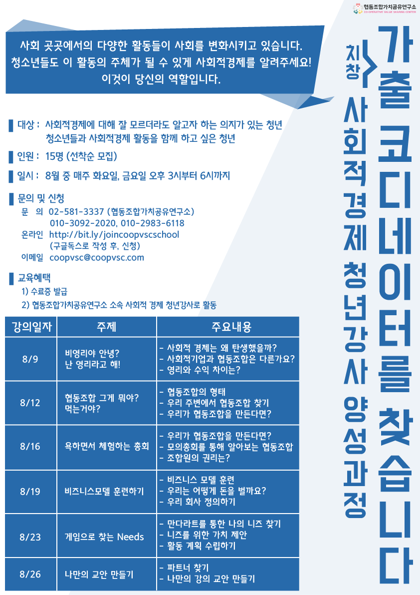 [안내] 사회적 경제 청년 강사 양성 과정 -가출 코디네이터 모집(~8.5)