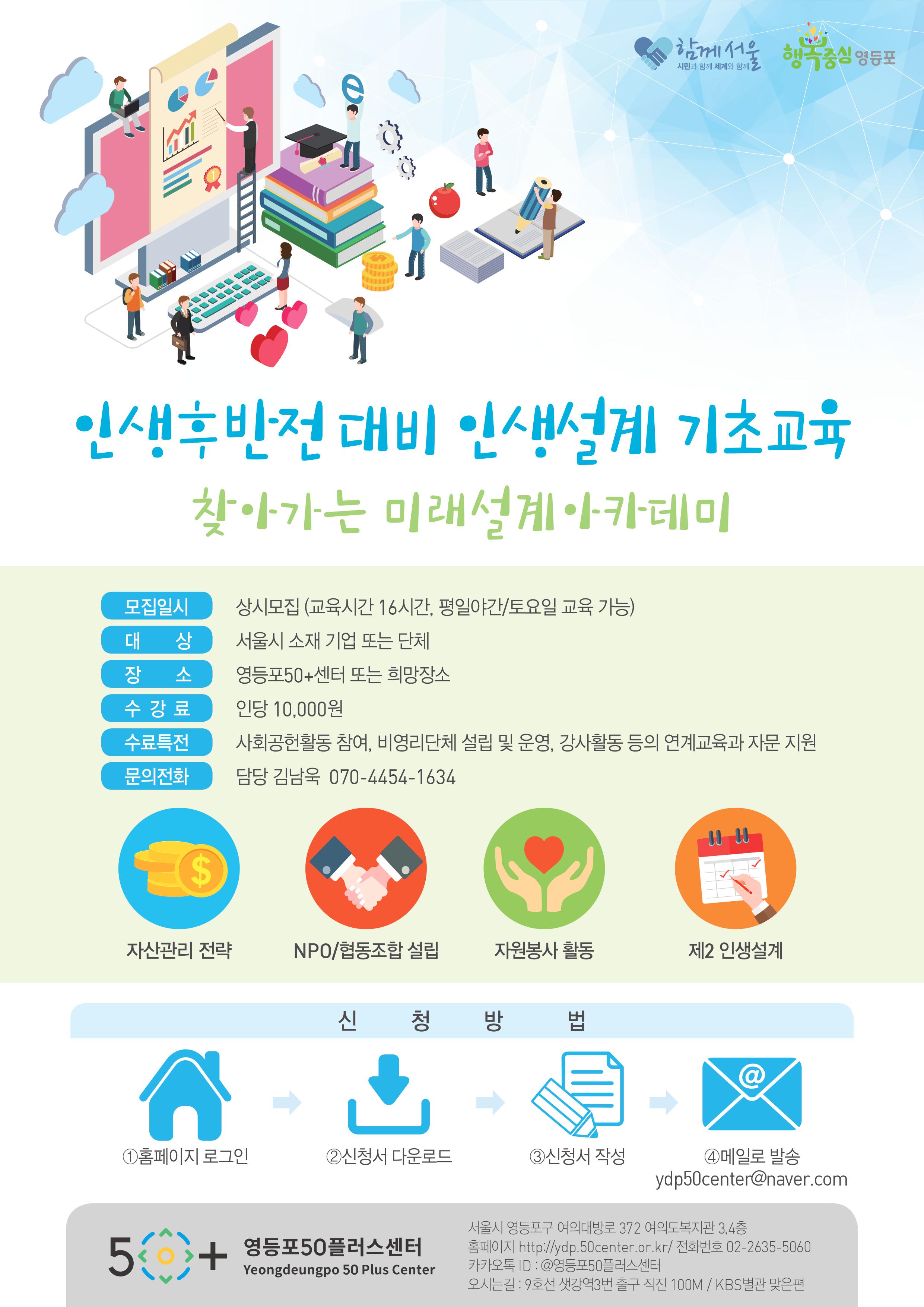사회적경제 공지 [안내] 영등포50플러스센터 ‘찾아가는 미래설계아카데미’ 수강모집(~12.30상시) 2016-07-22 조회 : 565댓글 : 0 주최/주관 : 관리자 50플러스미래설계아카데미.jpg 50플러스미래설계아카데미 < > 인쇄 목록 수정
