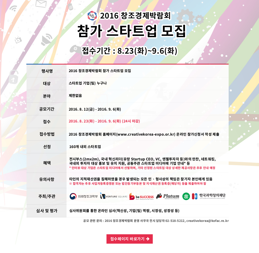사회적경제 공지 [안내] 2016창조경제박람회 참가 스타트업 모집(~9.6) 2016-08-23 조회 : 458댓글 : 0 주최/주관 : 관리자 poster.jpg poster < > 인쇄 목록 수정
