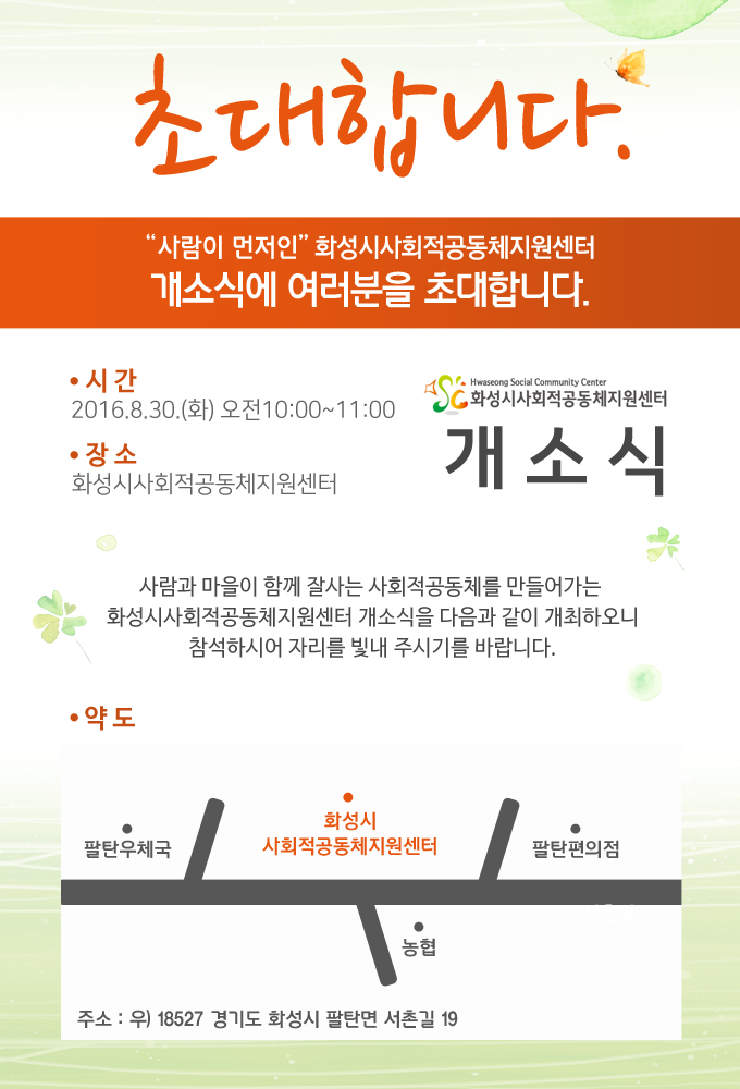 사회적경제 공지 [안내] 화성시사회적공동체지원센터 개소식에 초대합니다(8.30) 2016-08-28 조회 : 1393댓글 : 0 주최/주관 : 관리자 모집일정 : 2016-08-30 ~ 2016-08-30 0823_초대장_수정ver04.jpg 0823_초대장_수정ver04 개소식 화성 < > 인쇄 목록 수정