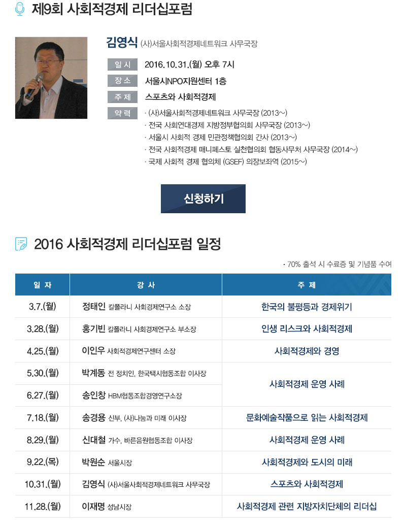 사회적경제 공지 [안내] 2016 사회적경제 리더십포럼 제9회 – 스포츠와 사회적경제(10.31) 2016-10-07 조회 : 746댓글 : 0 주최/주관 : 관리자 모집일정 : 2016-10-31 ~ 2016-10-31 김영식 리더십포럼 사단법인선 스포츠 < > 인쇄 목록 수정