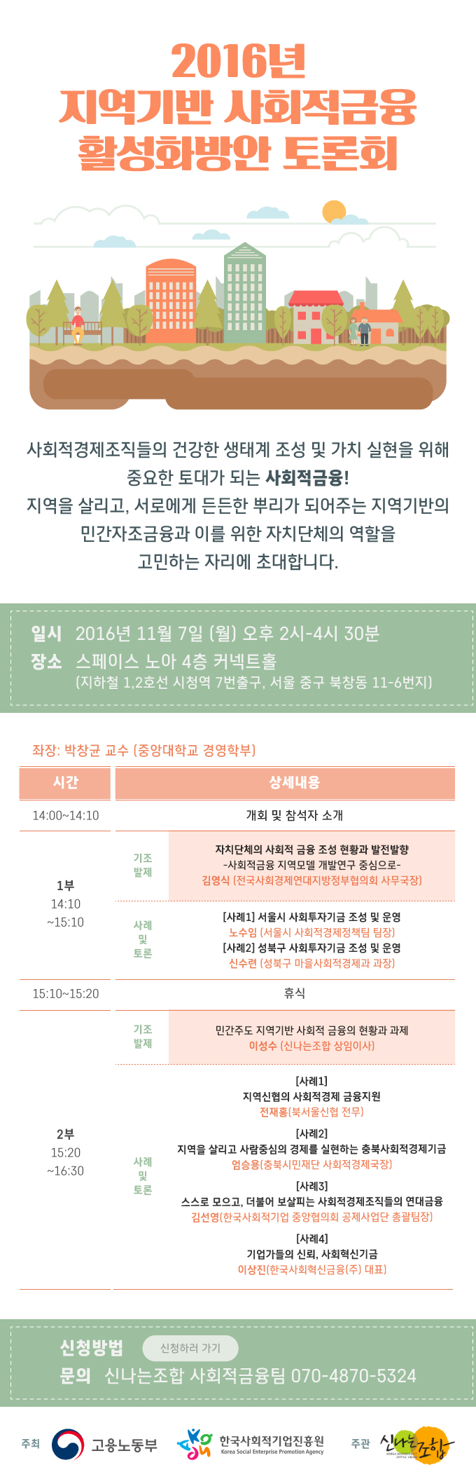 사회적경제 공지 [안내] ‘신나는조합’2016년 지역기반 사회적금융 활성화방안 토론회 (11/7) 2016-10-20 조회 : 530댓글 : 0 주최/주관 : 관리자 2016년-지역기반-사회적금융-활성화방안-토론회공고.hwp20161020114759_kuefeoqp.jpg 2016년 지역기반 사회적금융 활성화방안 토론회공고 첨부파일 2016년 지역기반 사회적금융 활성화방안 토론회공고 (162 kB) 2016년 지역기반 사회적금융 활성화방안 토론회공고 20161020114759_kuefeoqp < > 인쇄 목록 수정