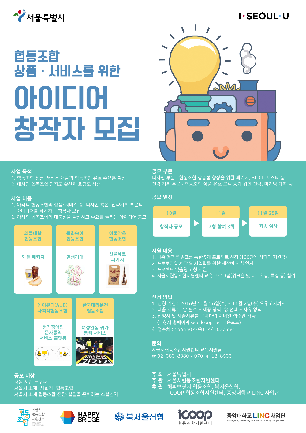 사회적경제 공지 [공모] 협동조합 상품.서비스 콜라보레이션 아이디어 공모전(~11.2) 2016-10-24 조회 : 690댓글 : 0 주최/주관 : 관리자 16-24_협동조합-전략상품-콜라보레이션-아이디어+창작자-모집_공고문_v120161003.hwp콜라보사업-웹자보-뒤-웹용.jpg콜라보사업-웹자보웹용.png 16-24_협동조합 전략상품 콜라보레이션 아이디어+창작자 모집_공고문_v1[20161003] 첨부파일 16-24_협동조합 전략상품 콜라보레이션 아이디어+창작자 모집_공고문_v1[20161003] (147 kB) 16-24_협동조합 전략상품 콜라보레이션 아이디어+창작자 모집_공고문_v1[20161003] 콜라보사업 웹자보 (뒤, 웹용) 콜라보사업 웹자보(웹용) < > 인쇄 목록 수정