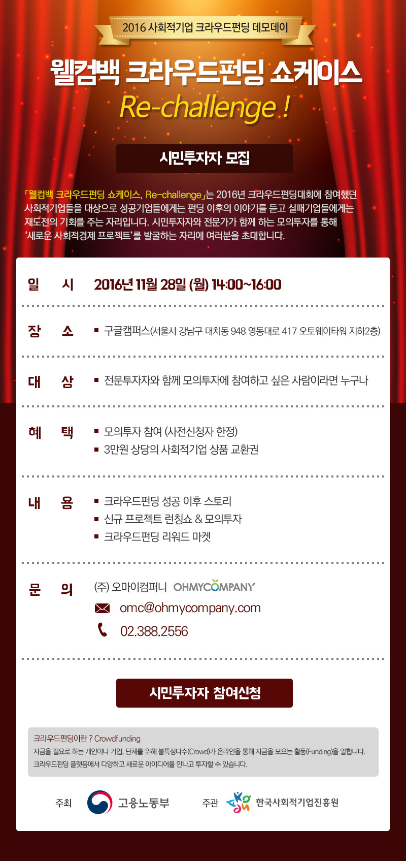 [안내] 2016 사회적기업 크라우드펀딩대회 사후관리행사 – ‘웰컴백 크라우드펀딩 쇼케이스, Re-challenge!’ 시민투자자 모집 (11.28)