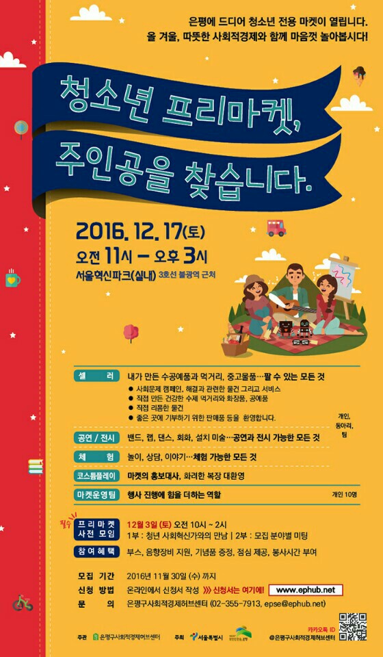 사회적경제 공지 [안내] 은평 청소년 전용마켓 ‘청소년 프리마켓, 주인공을 찾습니다'(12.17) 2016-11-28 조회 : 772댓글 : 0 주최/주관 : 관리자 모집일정 : 2016-12-17 ~ 2016-12-17 KakaoTalk_20161123_130506252.jpg [자세한 내용 보기] http://www.ephub.net KakaoTalk_20161123_130506252 은평 청소년 프리마켓 < > 인쇄 목록 수정