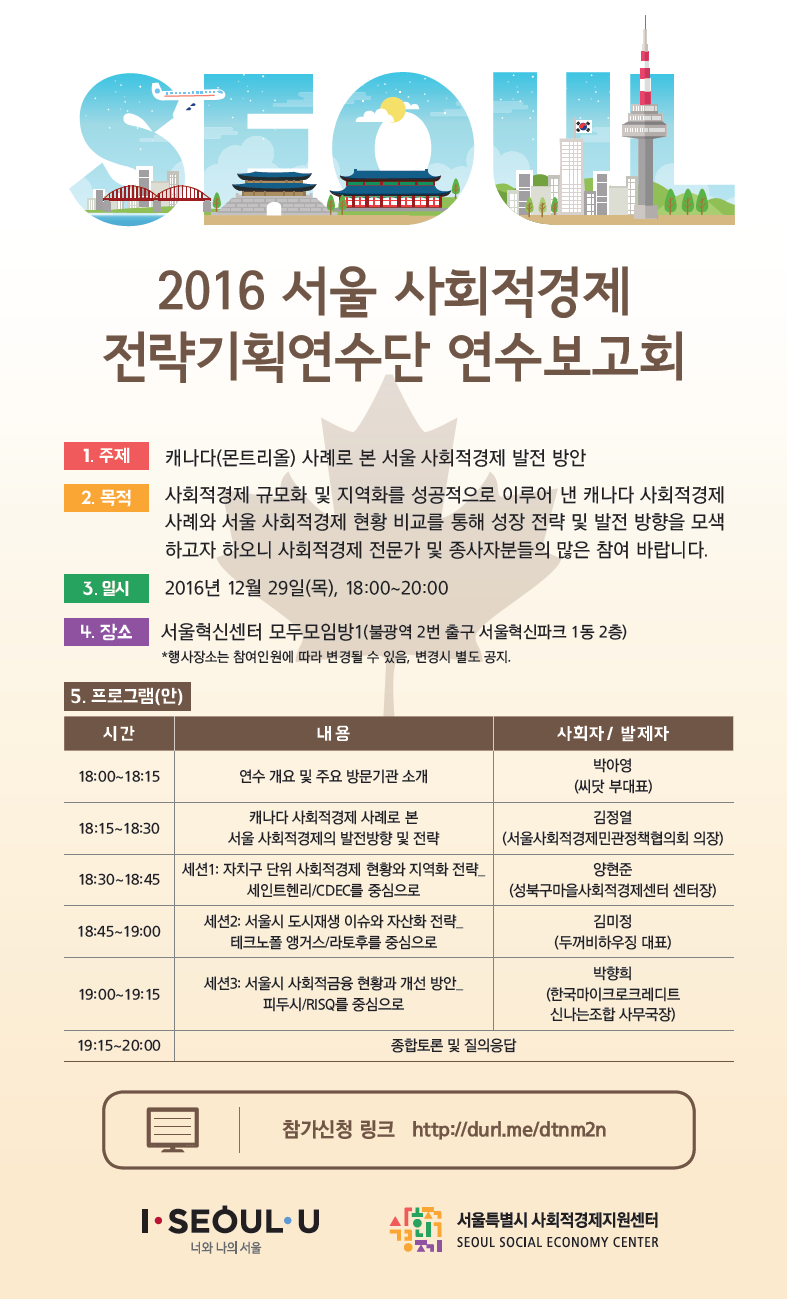 사회적경제 공지 [안내] 2016 서울 사회적경제 전략기획연수단 연수보고회(12.29) 2016-12-20 조회 : 797댓글 : 0 주최/주관 : 관리자 KakaoTalk_20161220_113512372.png [참가신청 하기] http://durl.me/dtnm2n kakaotalk_20161220_113512372 도시재생 사회적금융 캐나다 해외연수 < > 인쇄 목록 수정