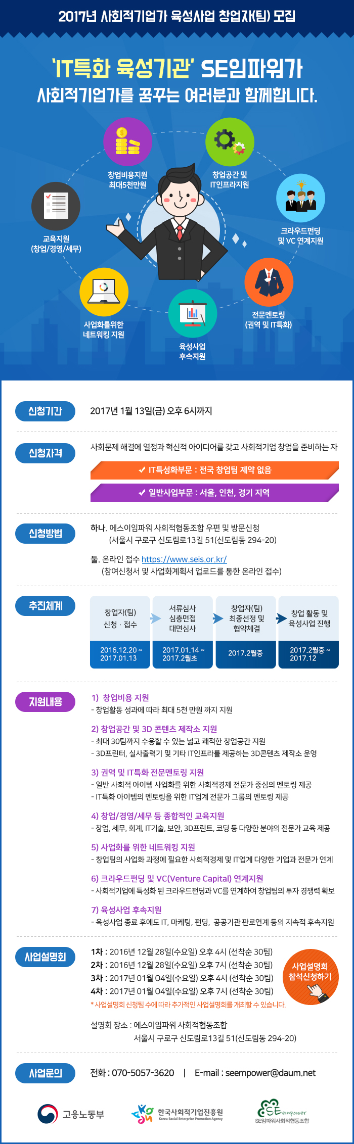 사회적경제 공지 [안내] SE임파워 ‘IT특화’ 2017년 사회적기업가 육성사업 창업자(팀) 모집(~1.13) 2016-12-29 조회 : 546댓글 : 0 주최/주관 : 관리자 20161229_045838.hwp20161229_045835.hwp20161229_045831.hwp20161229_045704.jpg [관련서류 다운로드] [붙임1] 2017년 사회적기업가 육성사업 창업자(팀) 모집공고문 [붙임2] 2017년 사회적기업가 육성사업 창업자(팀) 신청서류 [붙임3] 2017년 사회적기업가 육성사업 운영지침 첨부파일 [붙임3] 2017년 사회적기업가 육성사업 운영지침 (313 kB)[붙임2] 2017년 사회적기업가 육성사업 창업자(팀) 신청서류 (43 kB)[붙임1] 2017년 사회적기업가 육성사업 창업자(팀) 모집공고문 (104 kB) [붙임1] 2017년 사회적기업가 육성사업 창업자(팀) 모집공고문 [붙임2] 2017년 사회적기업가 육성사업 창업자(팀) 신청서류 [붙임3] 2017년 사회적기업가 육성사업 운영지침 다운로드 IT SE임파워 사회적기업가 에스이임파워 육성사업 창업 한국사회적기업진흥원 < > 인쇄 목록 수정