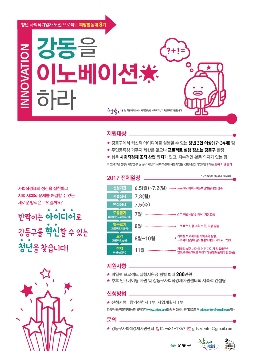 사회적경제 공지 [공고]청년 사회적기업가 도전 프로젝트 ‘강동을 이노베이션하라’ 모집(~7.2) 2017-06-14 조회 : 505댓글 : 0 주최/주관 : 관리자 20170614_071809.hwp20170614_071804.hwp20170614_071724.jpg [다운로드] 2017_희망별동대_사업계획서_양식 2017_희망별동대_참가신청서 첨부파일 2017_희망별동대_사업계획서_양식 (12 kB)2017_희망별동대_참가신청서 (13 kB) 2017_희망별동대_참가신청서 2017_희망별동대_사업계획서_양식 2017 희망별동대 8기_전단지 < > 인쇄 목록 수정
