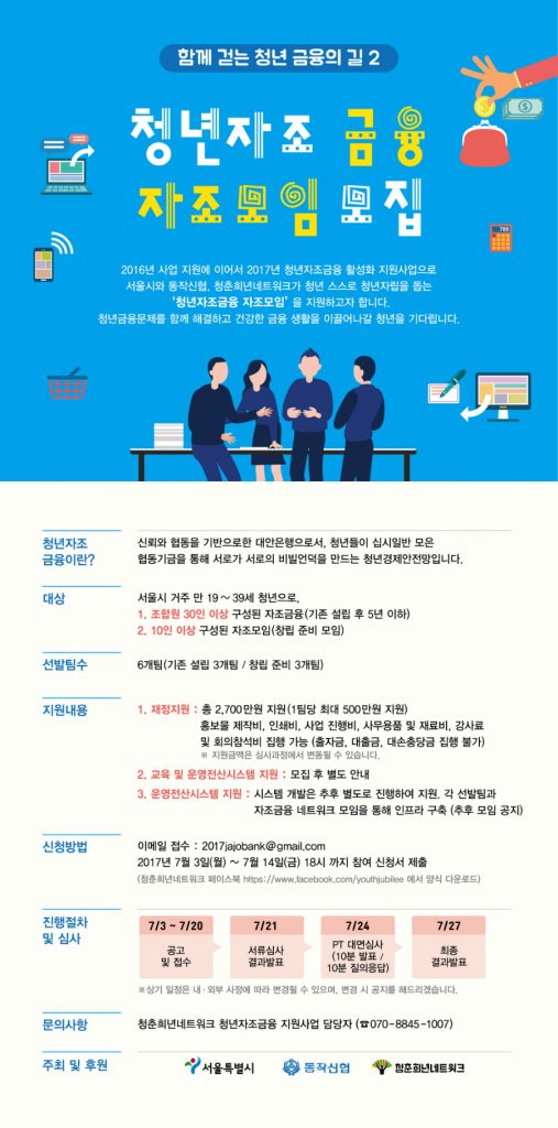 서울시와 동작신협, 청춘희년네트워크에서는 청년들이 모은 협동기금을 통해 지역단위의 비영리대안금고 역할을 할 수 있는 청년자조금융 육성사업을 진행하고 있습니다.