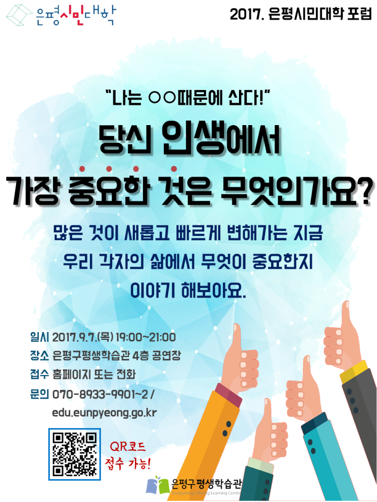 “나는 00 때문에 산다!” 당신 인생에서 가장 중요한 것은 무엇인가요?의 주제로 발표에 참여해주실 분들은 [은평구자원봉사센터] 김원영(사람책) [은평작은도서관협의체] 김은지(초록길도서관) [구산동도서관마을] 권봉래(슬로리딩 책모임) [다빈치실험실] 허성학(노동인권센터) [질문하는학교] 김민(진관동캠퍼스) 이렇게 다섯분인데요! 소소하지만 각자의 삶에서 무엇보다 빛나는 가치와 변화에 관한 소중한 이야기를 함께 해주신다고 해요.