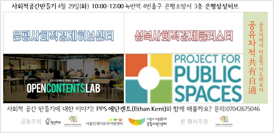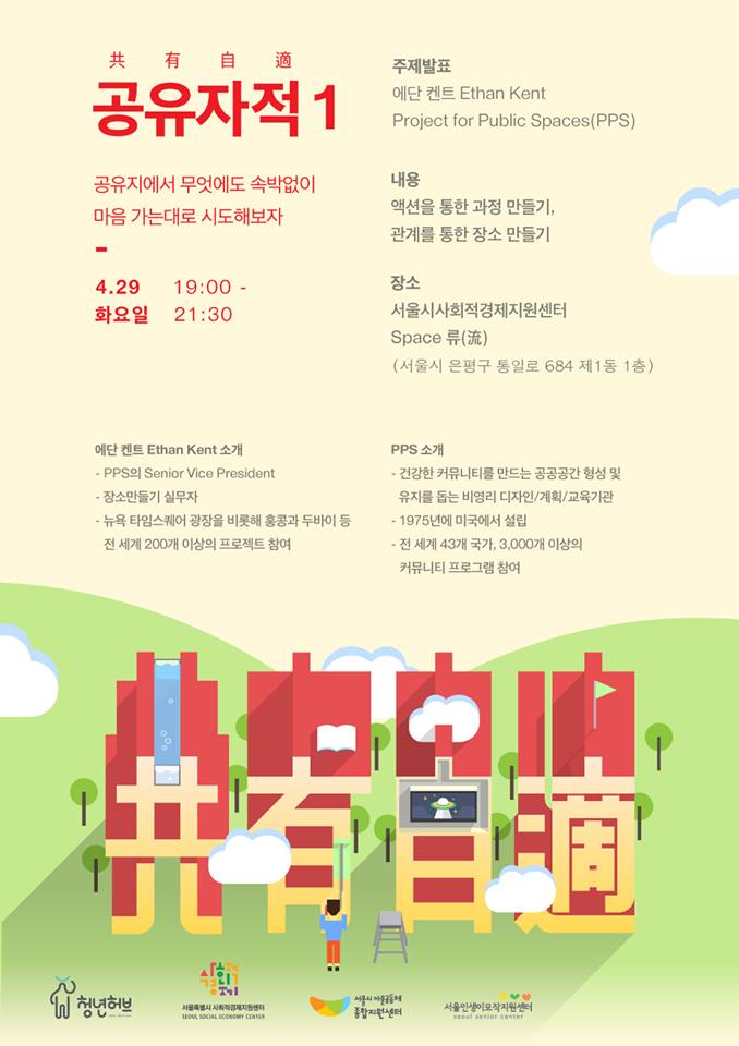 Project for Public Spaces는 미국에서 1975년에 만들어진 비영리 기관입니다. '장소만들기(Placemaking)'의 선두주자로 1975년 설립된 이후 전 세계의 3,000개가 넘는 커뮤니티 프로젝트에 참여해왔습니다. PPS의 Senior Vice President인 에단 켄트(Ethan Kent)가 '액션을 통한 과정 만들기, 관계를 통한 장소 만들기'라는 주제발표를 합니다. 국내 사례로 한평공원과 늘장의 발제 및 토론도 함께 진행될 예정입니다.