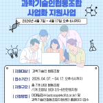 2026년도「과학기술인 협동조합 사업화 지원사업」연장 공고 과학기술인 협동조합의 자생력 증대와 사업 성공 가능성 확보를 위한 「과학기술인 협동조합 사업화 지원사업을 다음과 같이 연장 공고하오니 관련 절차에 따라 신청하여 주시기 바랍니다. 2026년 4월 7일 <주무부처> 부총리 겸 과학기술정보통신부 장관 배 경 훈 <주관기관> 한국과학기술단체총연합회 회장 권 오 남 1. 사업개요 〇 지원 유형별 대상 및 규모 가. (지원대상) 과학기술인 협동조합 […]