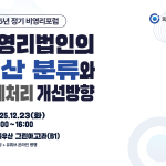 회계법인더함 2025년 정기 비영리 포럼에 여러분을 초대합니다. 일시 : 2025.12.23(화) 14:00 ~ 16:00 장소 : 초록우산 그린아고라(B1) *현장+유튜브 온라인 병행 본 포럼에서는 비영리법인 설립근거법률 및 행정지침 상의 재산 분류 체계를 종합적으로 검토하고, 공익법인회계처리기준 적용 시 현실에서 직면하는 문제점을 사례 중심으로 살펴보고자 합니다. 더불어 전문가 및 현장 실무자들과 함께 제도 개선방안을 논의함으로써, 향후 비영리 분야 규정의 […]