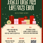 서울시사회적경제지원센터에서는 올해 마을기업 지원사업과 활동을 함께 돌아보고, 새로운 협력과 교류를 나누기 위한 <서울시 마을기업 네트워킹데이>를 운영하오니 많은 관심과 참여 부탁드리겠습니다. <2025 서울시 마을기업 네트워킹데이 개요> – 행 사 명: 2025년 서울시 마을기업 성과공유회&네트워킹 데이 – 운영일시: 2025년 12월 19일(금) 14~18시 – 운영장소: 코지컨벤션 신촌점(서울시 서대문구 연세로 8-1, 버티고타워 14층 컨벤션C홀) – 운영대상: 서울시 지정 마을기업, […]