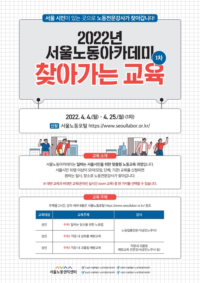 본 교육은 서울노동권익센터와 4대권역 노동자종합지원센터(도심권, 동남권, 동북권, 서남권)가 함께 협력진행 합니다.