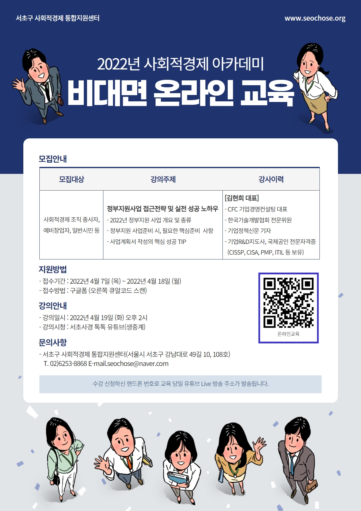 서초구 사회적경제 통합지원센터에서는 ‘정부지원사업 접근전략 및 실전 성공 노하우’를 주제로 유튜브live(www.youtube.com/channel/UChmjt1SP_25FhBnj7x1R49g)를 통한 온라인 교육을 실시합니다.