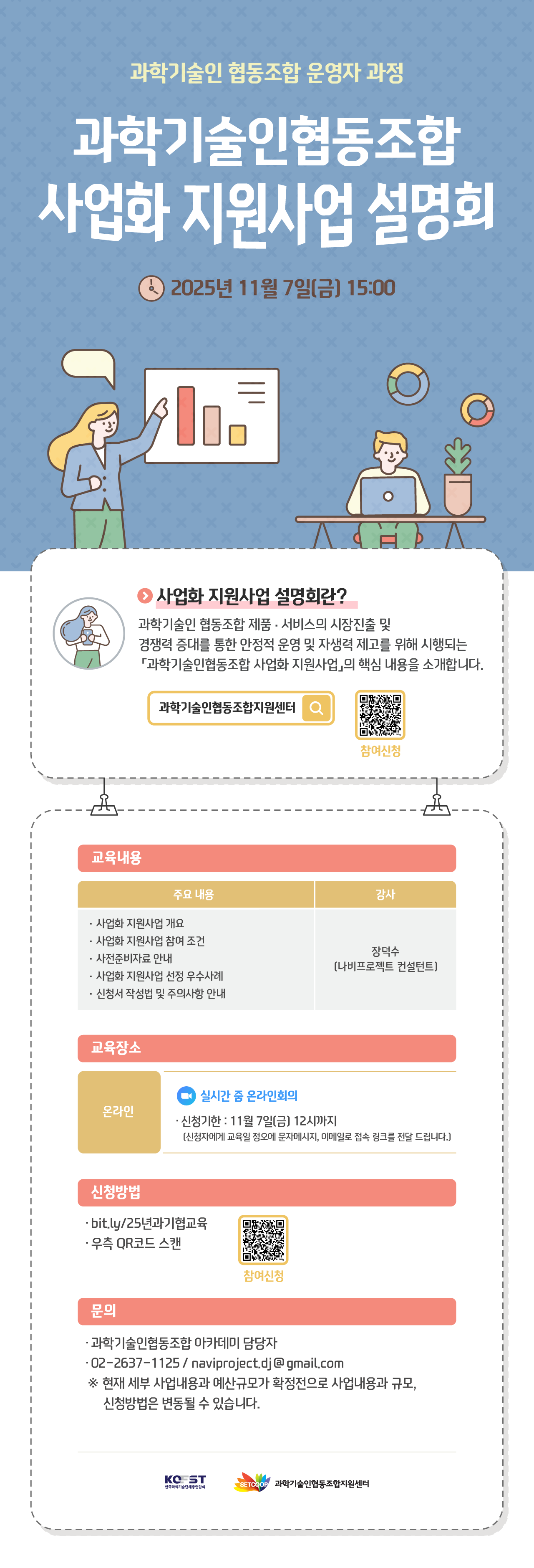 - 대상: 과학기술인협동조합 조합원 및 과학기술인협동조합 등록을 희망하는 조합